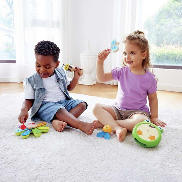 - CINCO INSTRUMENTOS PARA JUGAR: Este conjunto incluye una mariposa castañuela, una maraca abeja, una campana luciérnaga, un xilófono flor y una pandereta rana.