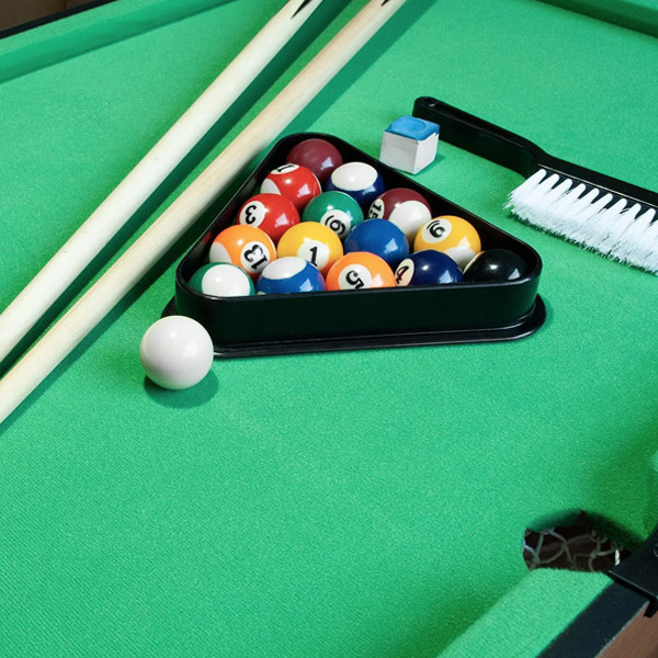 Esta mini mesa de pool de 73 cm de largo, 40 cm de ancho y 62 cm de alto, es perfecta para jugar en cualquier lugar. Fabricada en madera, es compacta y no es plegable. Incluye todo lo necesario para comenzar a jugar: pelotas, triángulo, tiza y dos tacos.