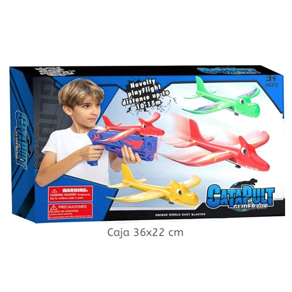 Diversión jurásica al máximo. Descubre la increíble pistola catapulta manual de 26 cm que lanza un planeador dinosaurio plumavit de 34.5 cm hasta 15 metros de distancia. Fácil de usar, segura y perfecta para horas de entretenimiento al aire libre. Ideal para niños aventureros que aman los dinosaurios y la acción.